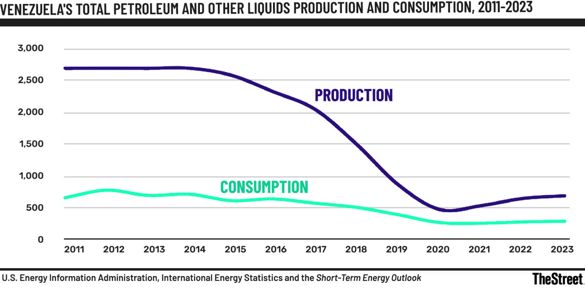 Quick fact: Venezuela’s peak production totaled 3.75 millionbarrels per day. In 2025, it totals about 800,000, up from a low of about 350,000 in 2020.