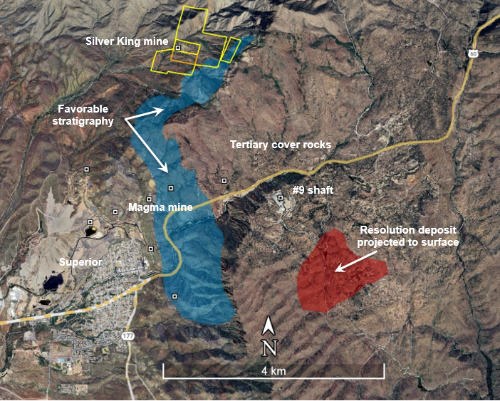 Figure 3 . Map showing Silver King project and nearby mineral deposits. The Silver King deposit is located three kilometers from the Resolution Copper deposit (a joint venture between Rio Tinto and BHP) and the high-grade Magma mine, a former copper and silver producer.