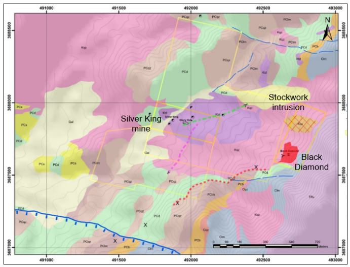 Figure 1 . Geologic and land map of the Silver King project showing newly described polymetallic vein in magenta (Ag-Pb-Zn), copper vein in green (Cu-Ag) and stratigraphically controlled replacement mineralization in red. The strongly altered intrusion with stock work quartz-pyrite veining is indicated by the crosshatch.